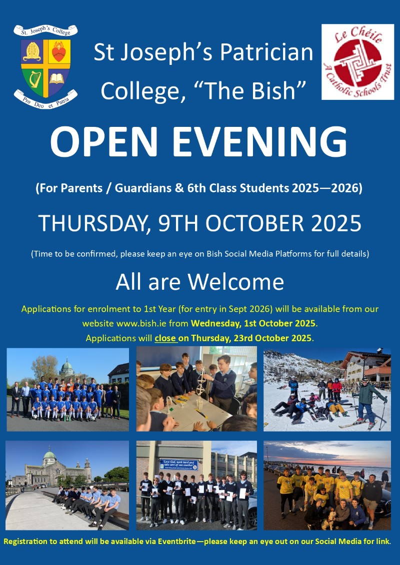 Registration to attend our Open Evening, which will take place on Thursday 9th October, is via Eventbrite. (Registration will open on the 29th September). Click link here.